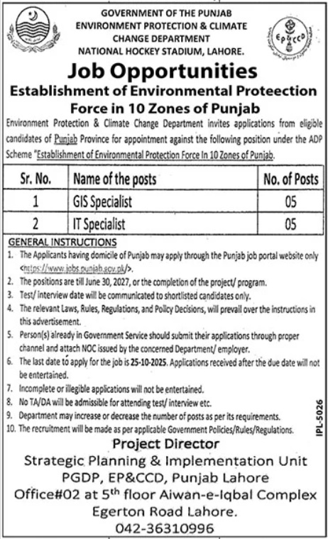 Envinometal Protection & Climate Change Department Punjab Jobs 2025 for GIS / IT Specialists Apply Online Job Ad shown on this page is taken from Jang Newspaper on 08-10-2025