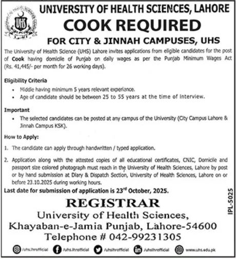 University of Health Sciences UHS Lahore Jobs 2025 for Cooks in City & Jinnah Campuses Job Ad shown on this page is taken from Jang Newspaper on 08-10-2025