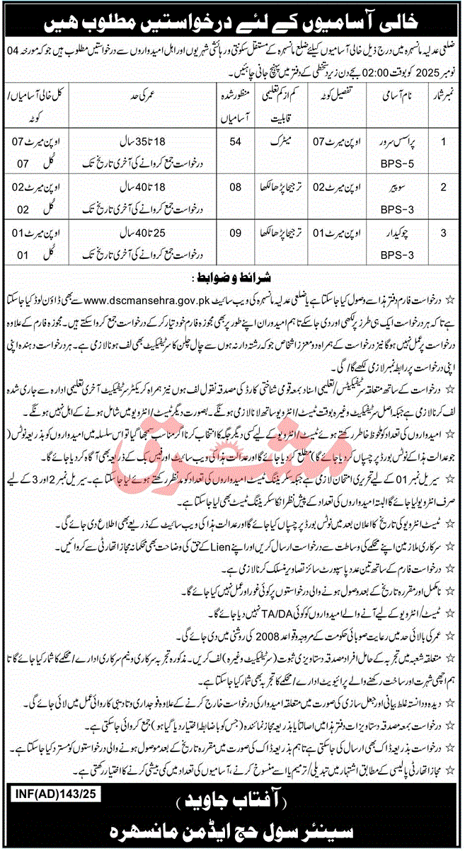 Advertisement of District Courts Manshera Jobs 2025 for Process Servers, Sweepers & Chowkidar-294988