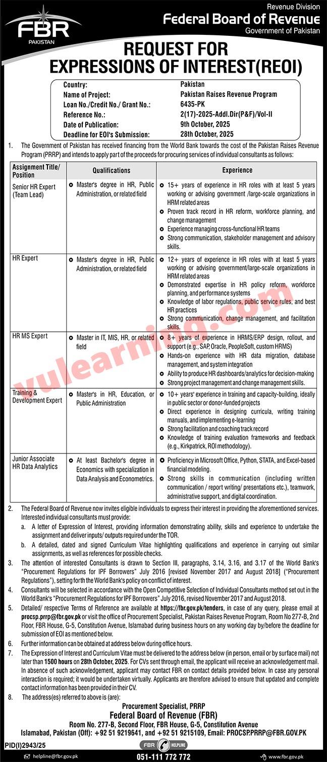 Federal Board of Revenue FBR Jobs 2025 for Pakistan Raises Revenue Program Project Job Ad shown on this page is taken from Express Newspaper on 09-10-2025