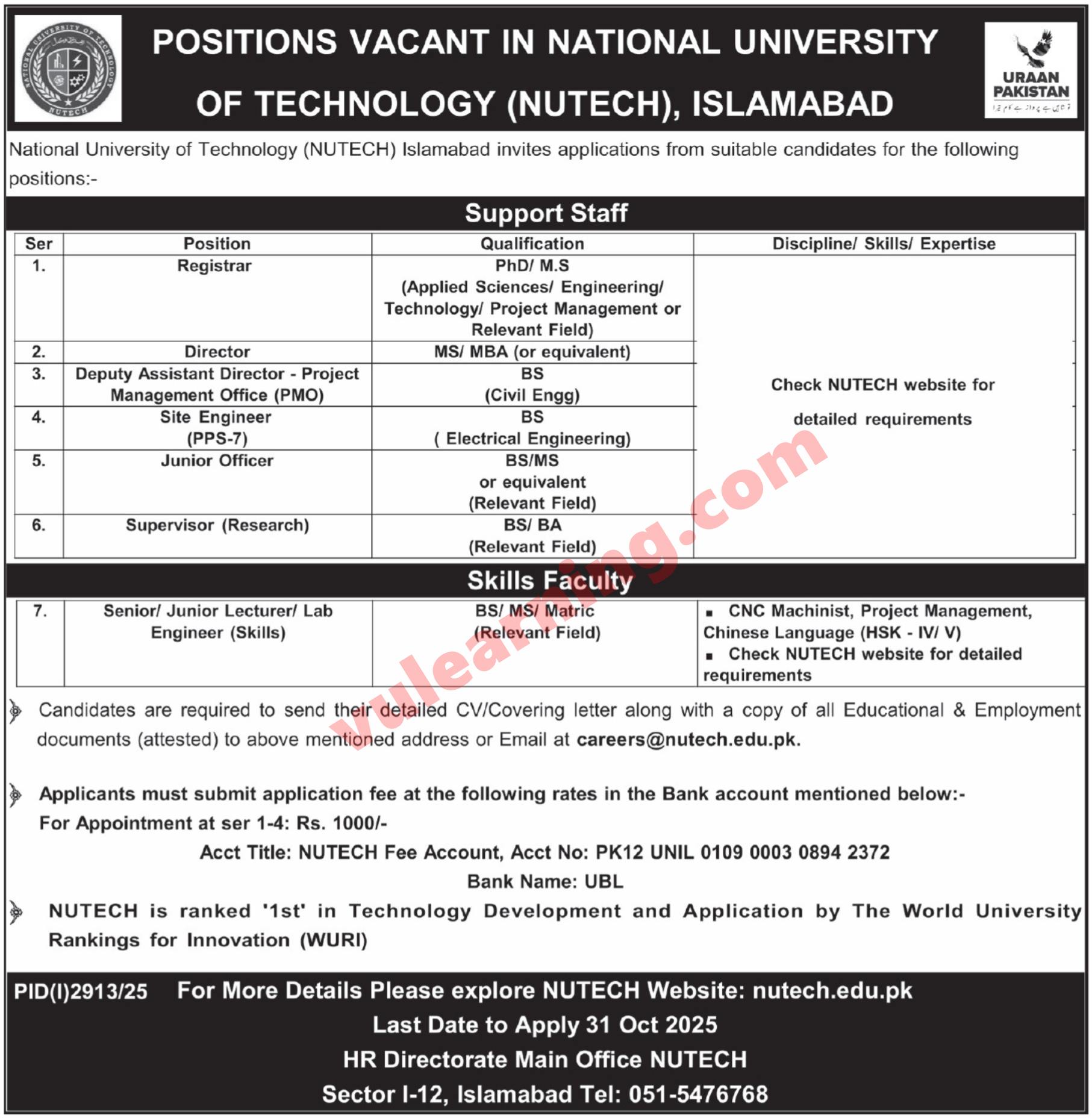 National University of Technology NUTECH Islamabad Jobs 2025 for Teaching & Non-Teaching Staff Job Ad shown on this page is taken from Express Newspaper on 09-10-2025