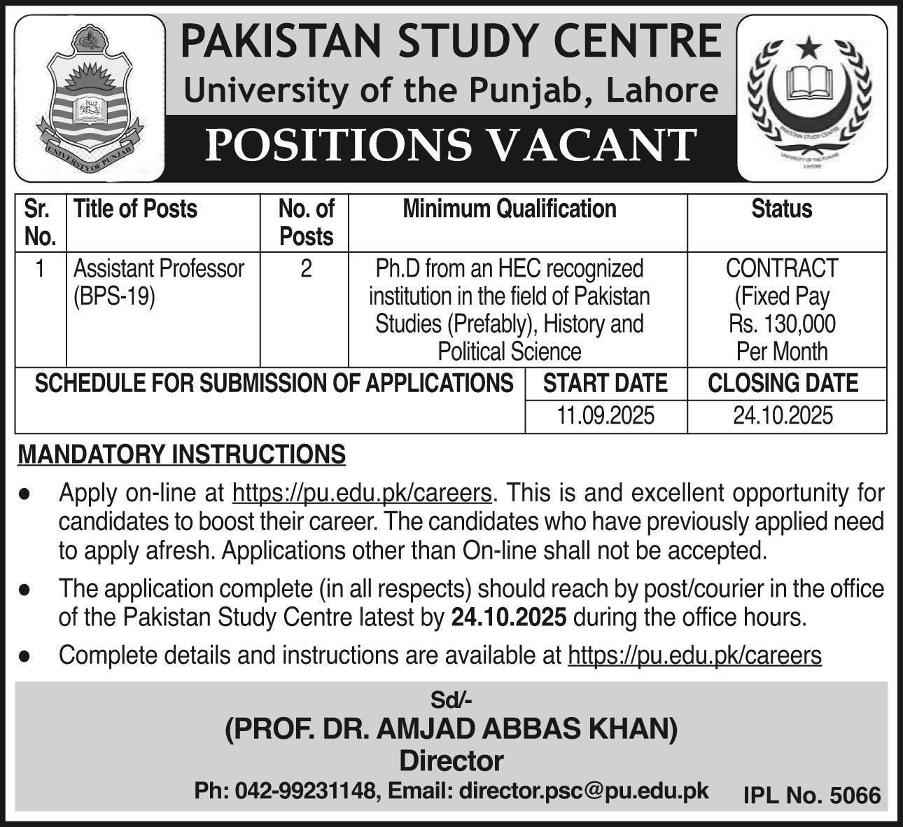 Pakistan Study Centre University of the Punjab PU Lahore Jobs 2025 for Teaching Faculty Job Ad shown on this page is taken from Jang Newspaper on 09-10-2025