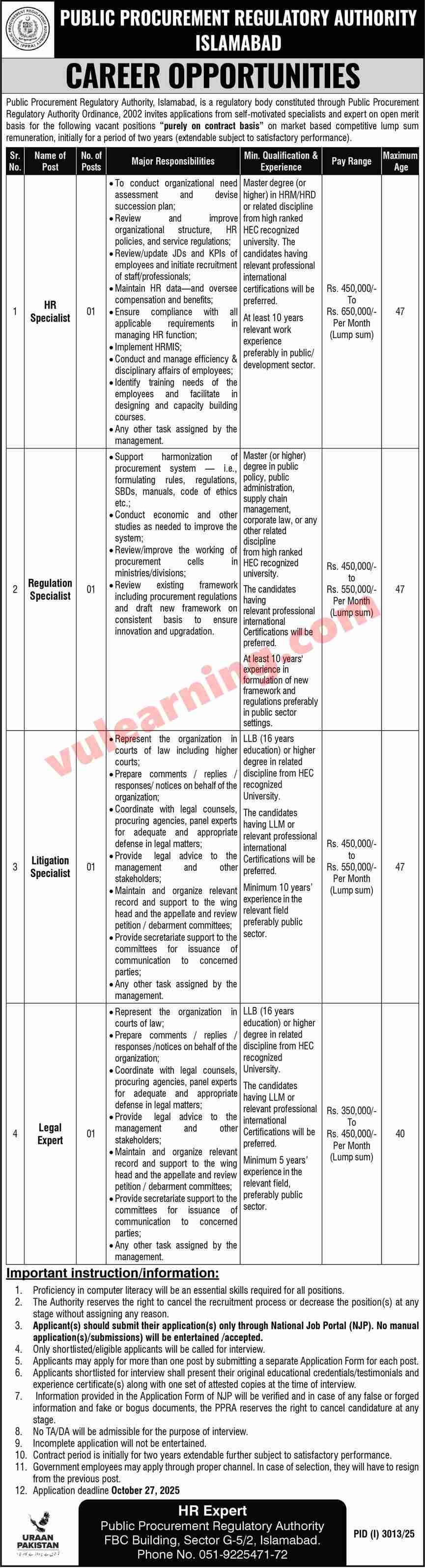 Public Procurement Regulatory Authority Islamabad Jobs 2025 Apply Online PPRA Latest Job Ad shown on this page is taken from Express Newspaper on 12-10-2025