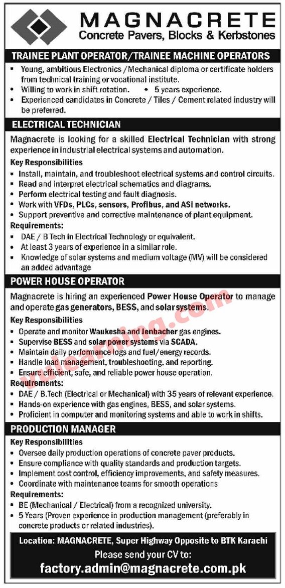 Magnacrete Jobs 2025 for Trainee Operators, Manager, Technicians & Others in Karachi Job Ad shown on this page is taken from Dawn Newspaper on 12-10-2025