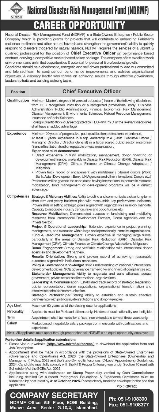 NDRMF Jobs 2025 National Disaster Risk Management Fund Islamabad Job Ad shown on this page is taken from Express Newspaper on 12-10-2025