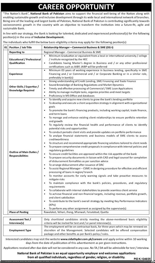 National Bank NBP Jobs 2025 Apply Online for Relationship Managers OG-I (Multiple Cities) Job Ad shown on this page is taken from The News Newspaper on 12-10-2025