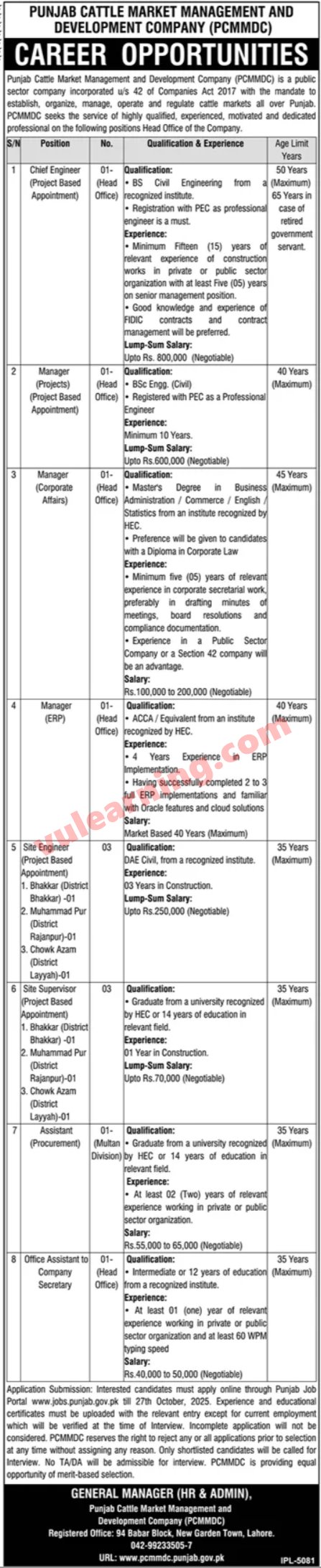 Punjab Cattle Market Management & Development Company Jobs 2025 for Engineers, Managers, Assistants & Others PCMMDC Job Ad shown on this page is taken from Jang Newspaper on 10-10-2025