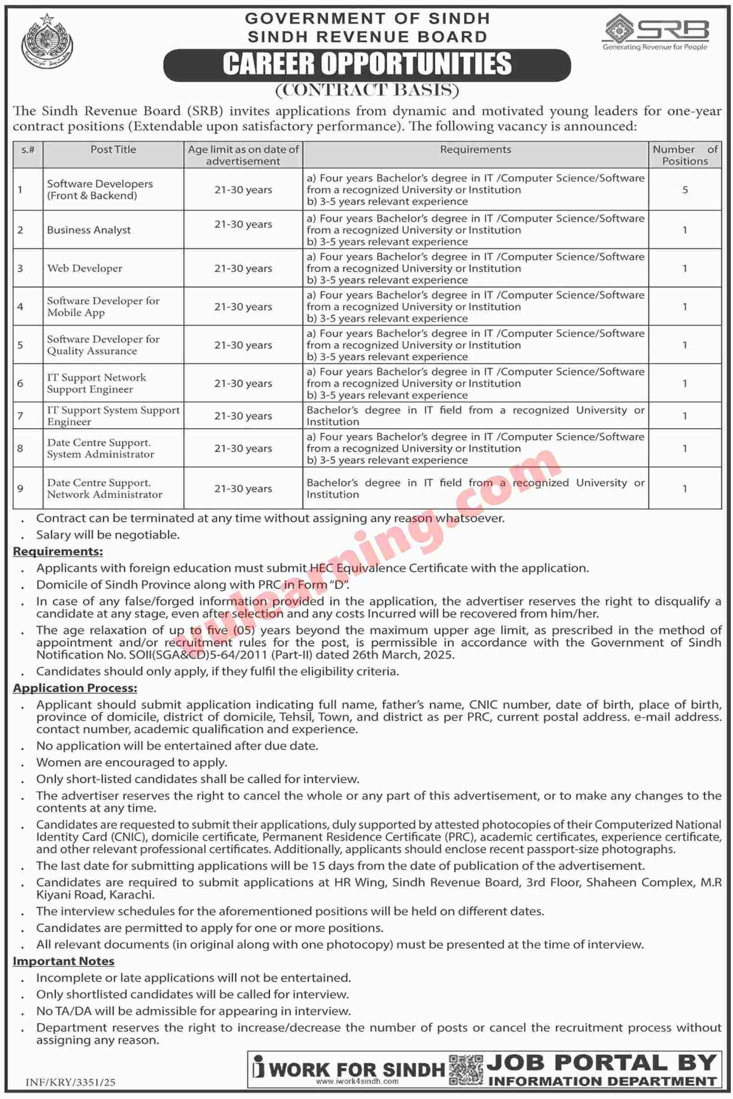 Sindh Revenue Board Jobs 2025 Software / Web Developers & Others SRB Latest Job Ad shown on this page is taken from Dawn Newspaper on 19-10-2025
