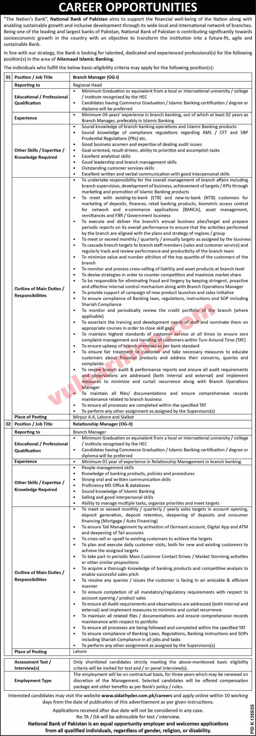 Advertisement of National Bank NBP Jobs Apply Online for Branch Managers OG-I & Relationship Managers OG-II-295074