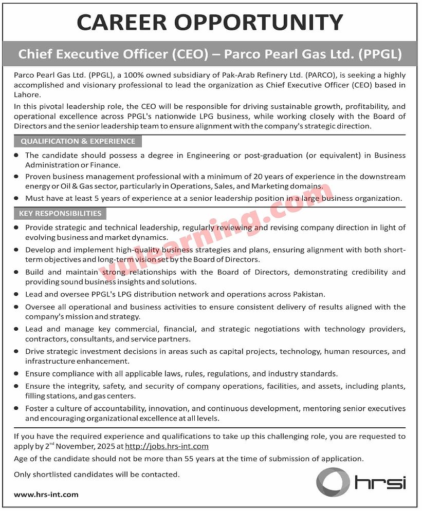 PARCO Pearl Gas Ltd Jobs 2025 for Chief Executive Officer (CEO) PPGL Via HRSI Job Ad shown on this page is taken from Dawn Newspaper on 19-10-2025