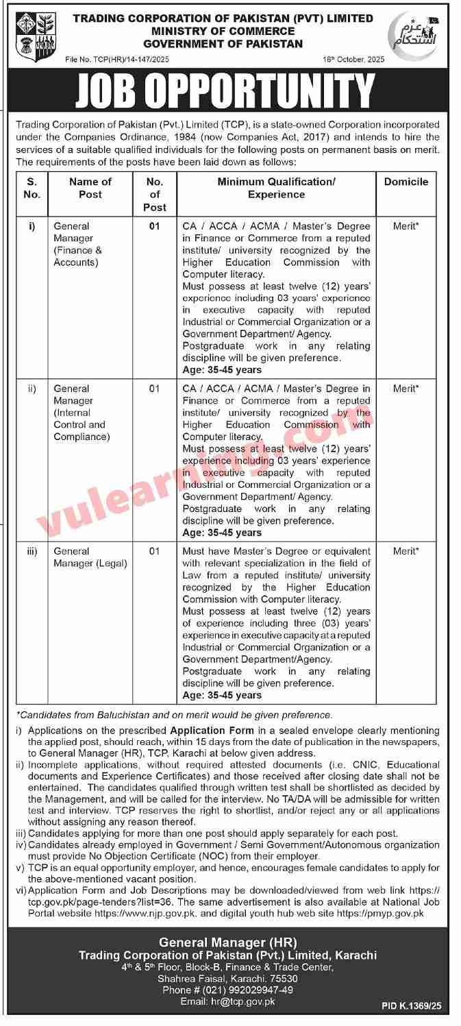 Advertisement of Trading Corporation of Pakistan TCP Jobs 2025 Ministry of Commerce Karachi-295081