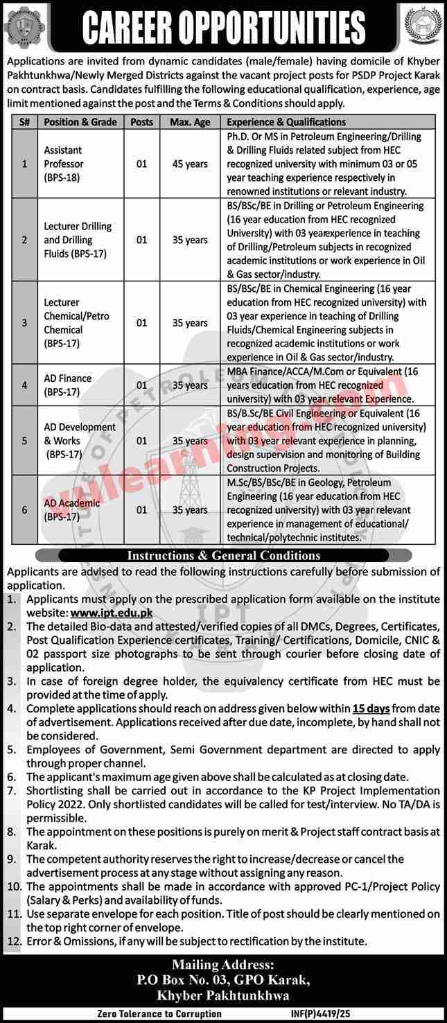Advertisement of PO Box 03 GPO Karak Jobs 2025 for Lecturers, Assistant Directors & Other Institute of Petroleum Technology Latest-295082