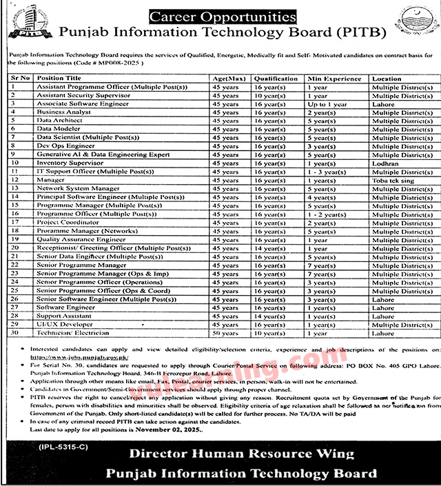 PITB Jobs 2025 Apply Online Punjab Information Technology Board Latest Job Ad shown on this page is taken from Nawa-e-waqt Newspaper on 19-10-2025