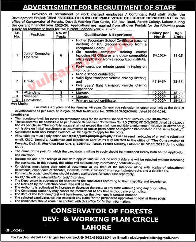 Forest Department Punjab Jobs 2025 Apply Online for Jr Computer Operators, Drivers, Sweepers, Attendants & Chowkidar Job Ad shown on this page is taken from Express Newspaper on 16-10-2025