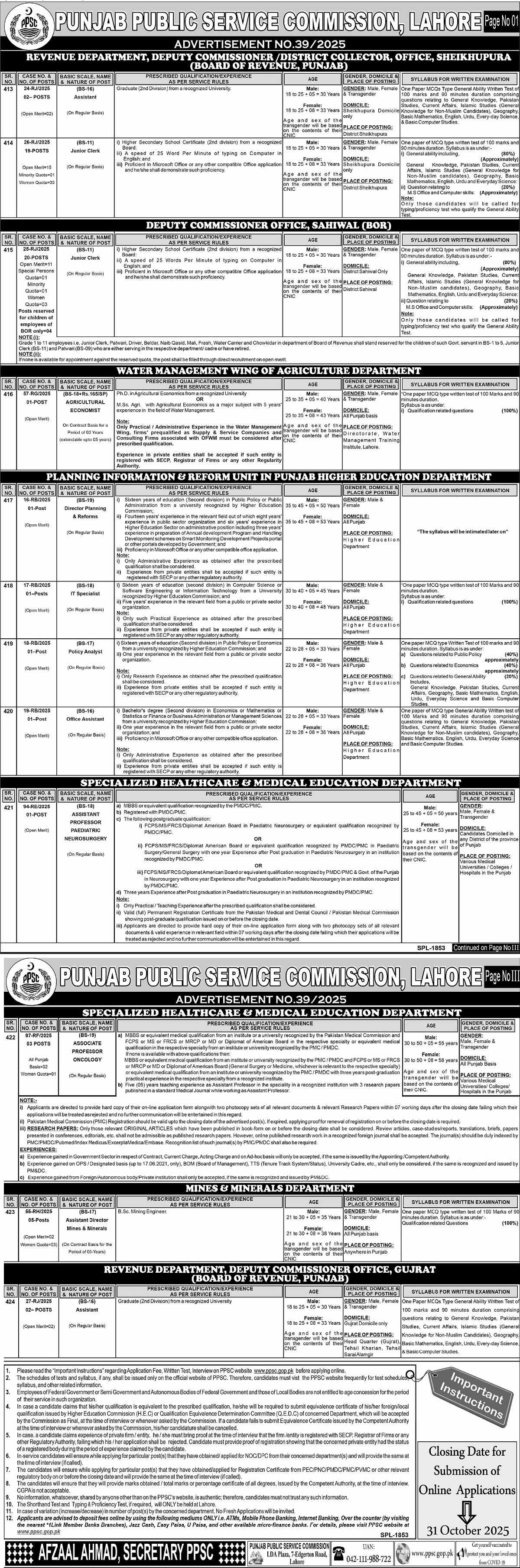 Advertisement of PPSC Jobs 2025 Apply Online for Jr Clerks, Assistants, Assistant Directors & Others Advertisement No. 39/2025 -295101