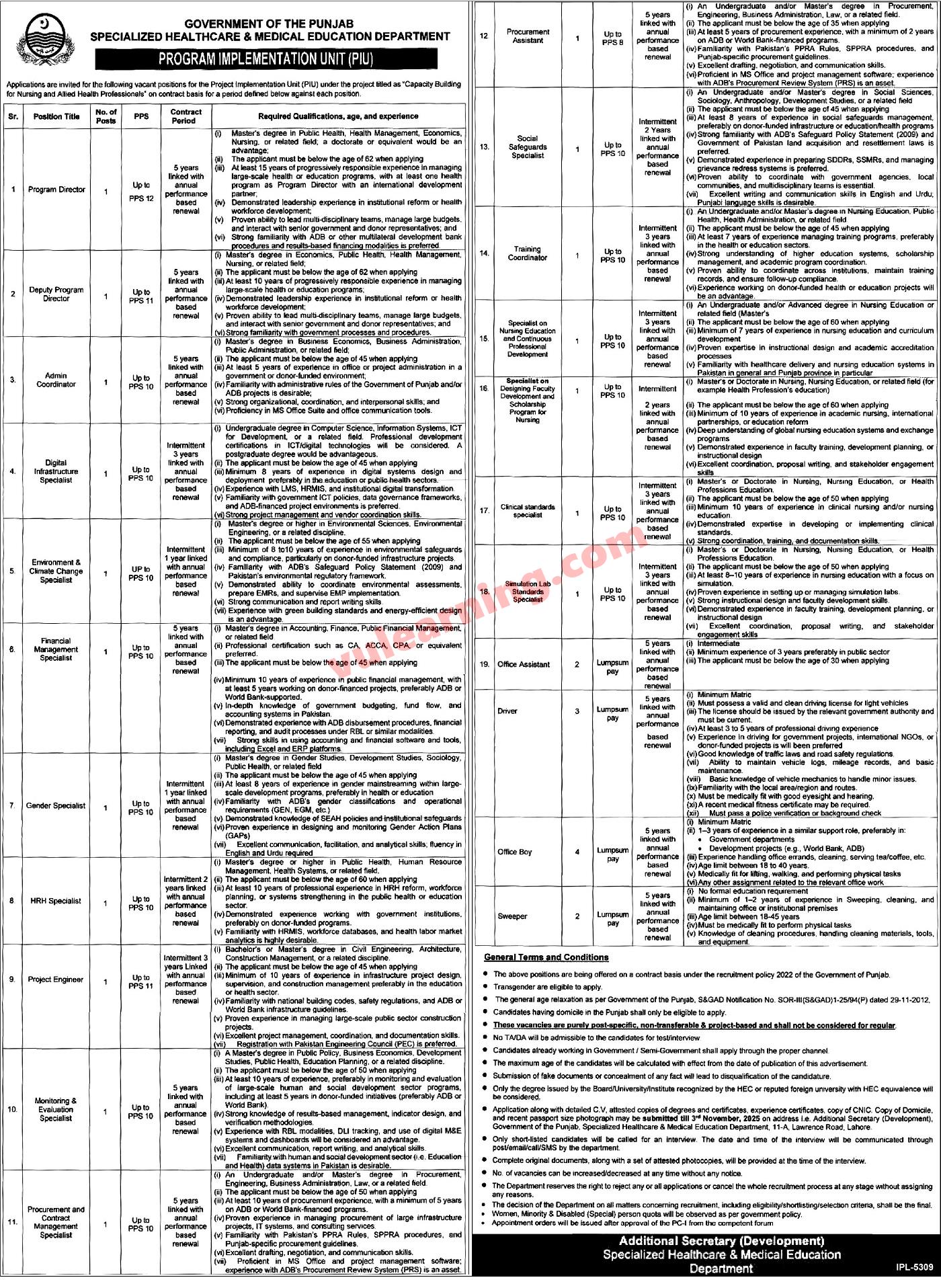 Advertisement of Specialized Healthcare & Medical Education Department Punjab Jobs 2025 for Drivers, Office Boys, Office Assistants, Sweepers & Others-295108