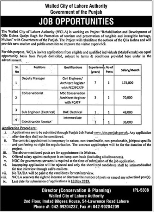 Walled City of Lahore Authority Jobs 2025 WCLA Apply Online Govt of Punjab Job Ad shown on this page is taken from Jang Newspaper on 17-10-2025