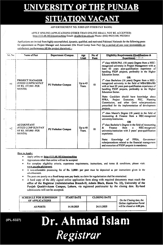 University of the Punjab PU Lahore Jobs 2025 Apply Online for Project Manager & Accountant Job Ad shown on this page is taken from Express Newspaper on 18-10-2025