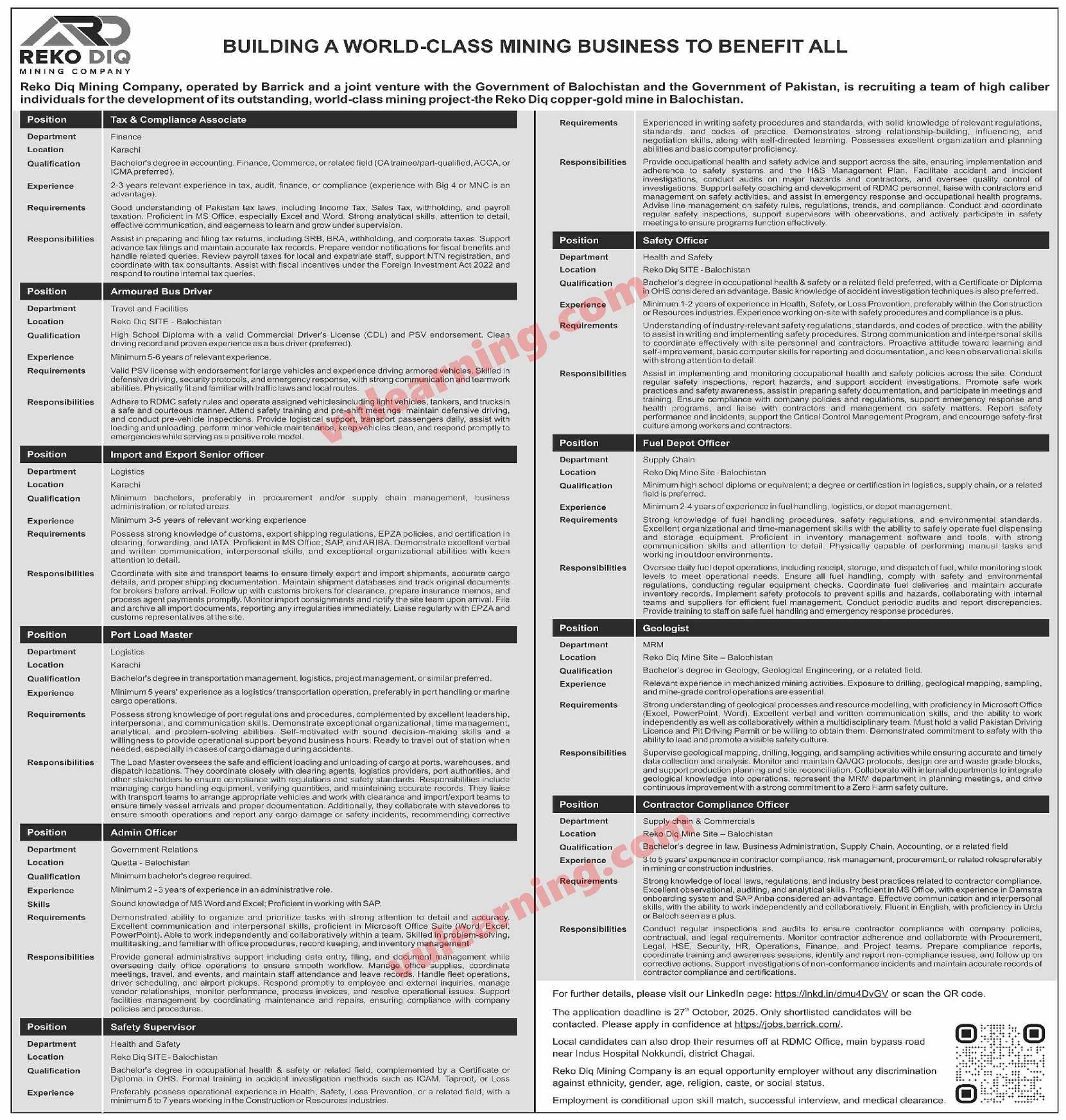 Reko Diq Mining Company Jobs 2025 Apply Online Barrick Pakistan Job Ad shown on this page is taken from Dawn Newspaper on 20-10-2025