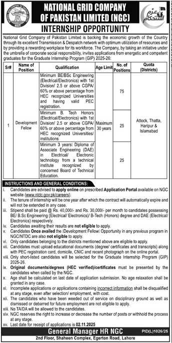 National Grid Company Jobs 2025 for 125 Development Fellows Apply Online Graduate Internship Program NTDC/ NGC Latest Job Ad shown on this page is taken from Nawa-e-waqt Newspaper on 20-10-2025