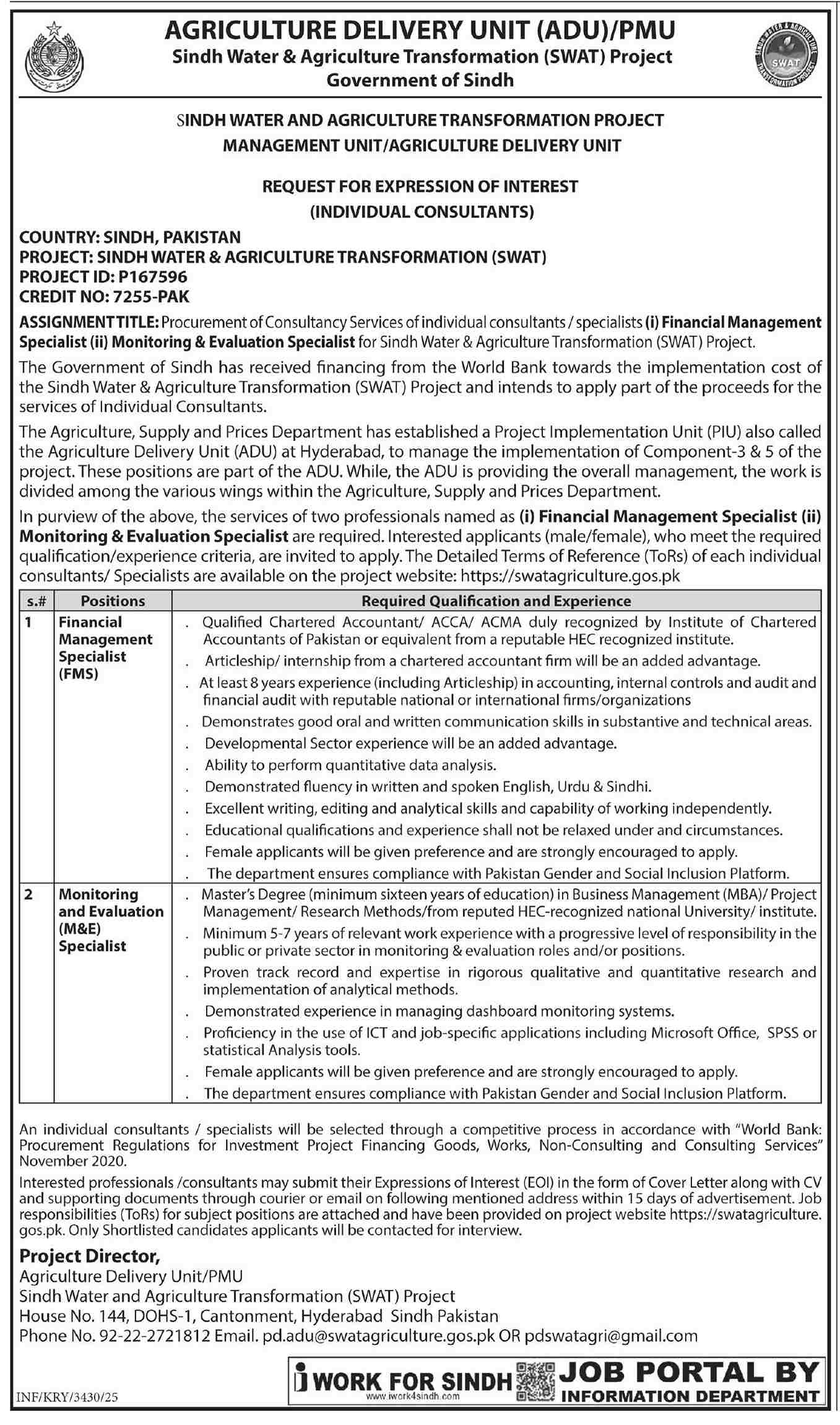 Sindh Water & Agriculture Transformation SWAT Project Jobs 2025 for Consultants Job Ad shown on this page is taken from Express Newspaper on 22-10-2025
