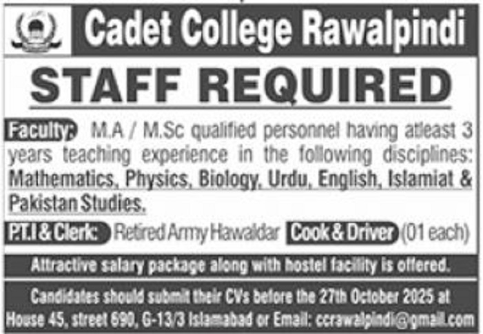Cadet College Rawalpindi Jobs 2025 for Teaching Staff, PTI, Clerk, Cook & Driver Job Ad shown on this page is taken from Jang Newspaper on 22-10-2025