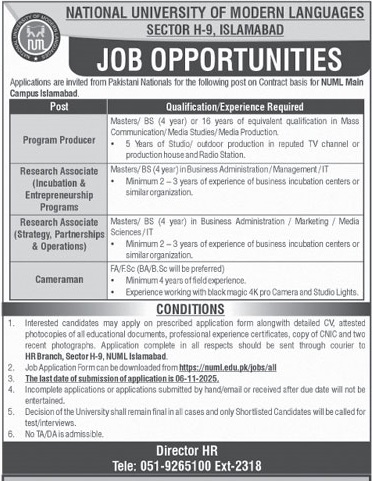 NUML University Jobs 2025 National University of Modern Languages Main Campus Islamabad Job Ad shown on this page is taken from Jang Newspaper on 23-10-2025