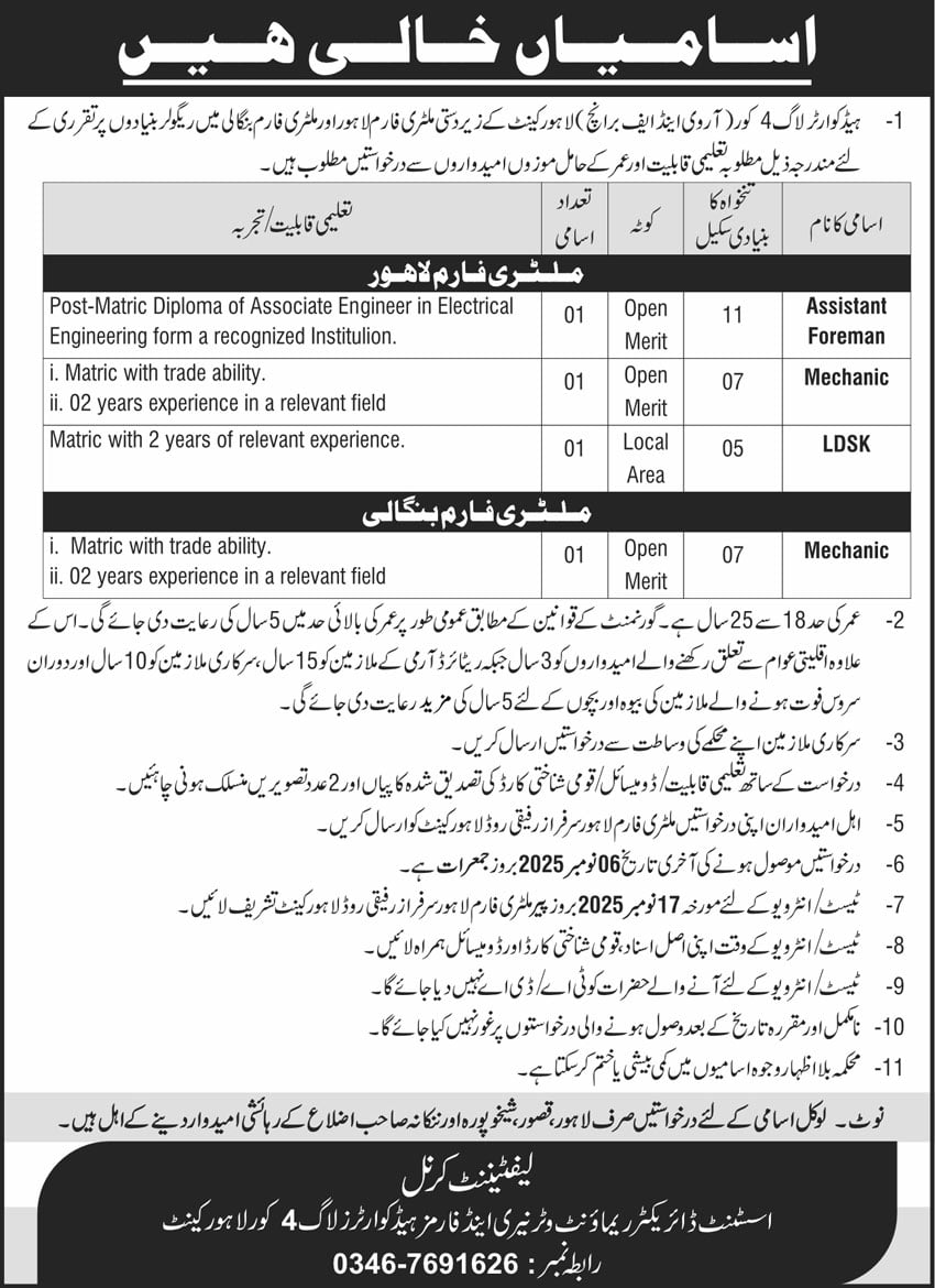 Advertisement of Military Farms Lahore Jobs 2025 for Assistant Foreman, Mechanics & Skilled Worker-295150
