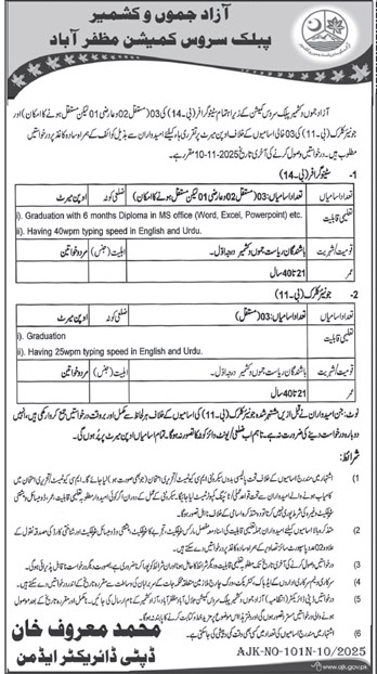 Advertisement of AJKPSC Jobs 2025 for Stenographers & Jr Clerks AJK Public Service Commission Muzaffarabad-295155