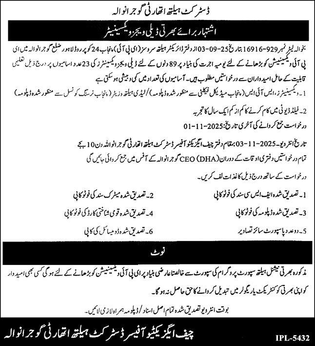 Health Department District Gujranwala Jobs 2025 for Vaccinators (Daily Wages) Job Ad shown on this page is taken from Express Newspaper on 23-10-2025