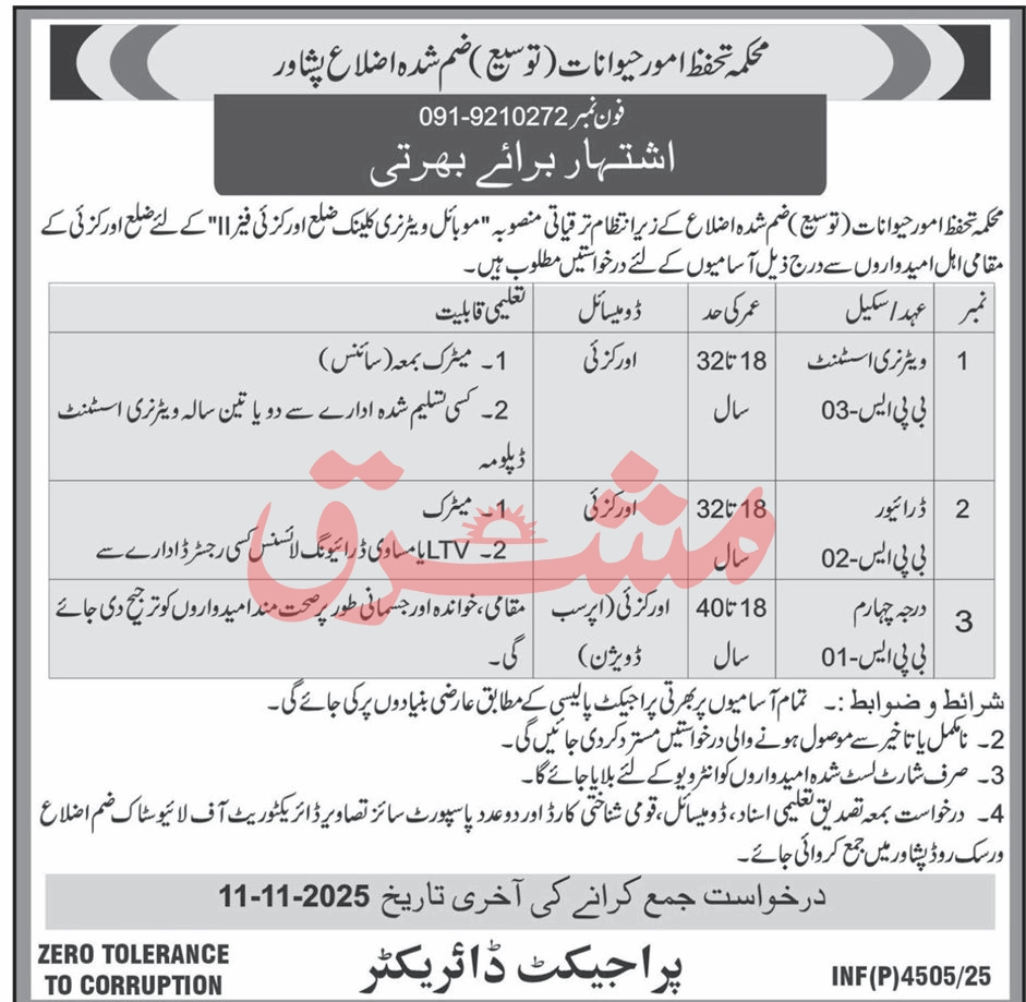 Livestock and Dairy Development KP Jobs 2025 for Drivers, Class IV Staff & Veterinary Assistant Job Ad shown on this page is taken from Mashriq Newspaper on 23-10-2025