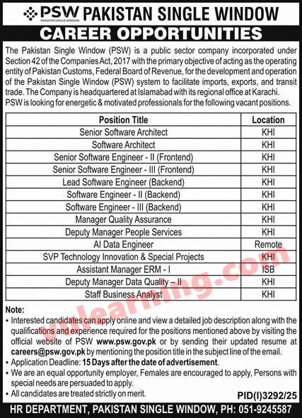 Advertisement of Pakistan Customs FBR Jobs 2025 Apply Online Pakistan Single Window PSW-295166