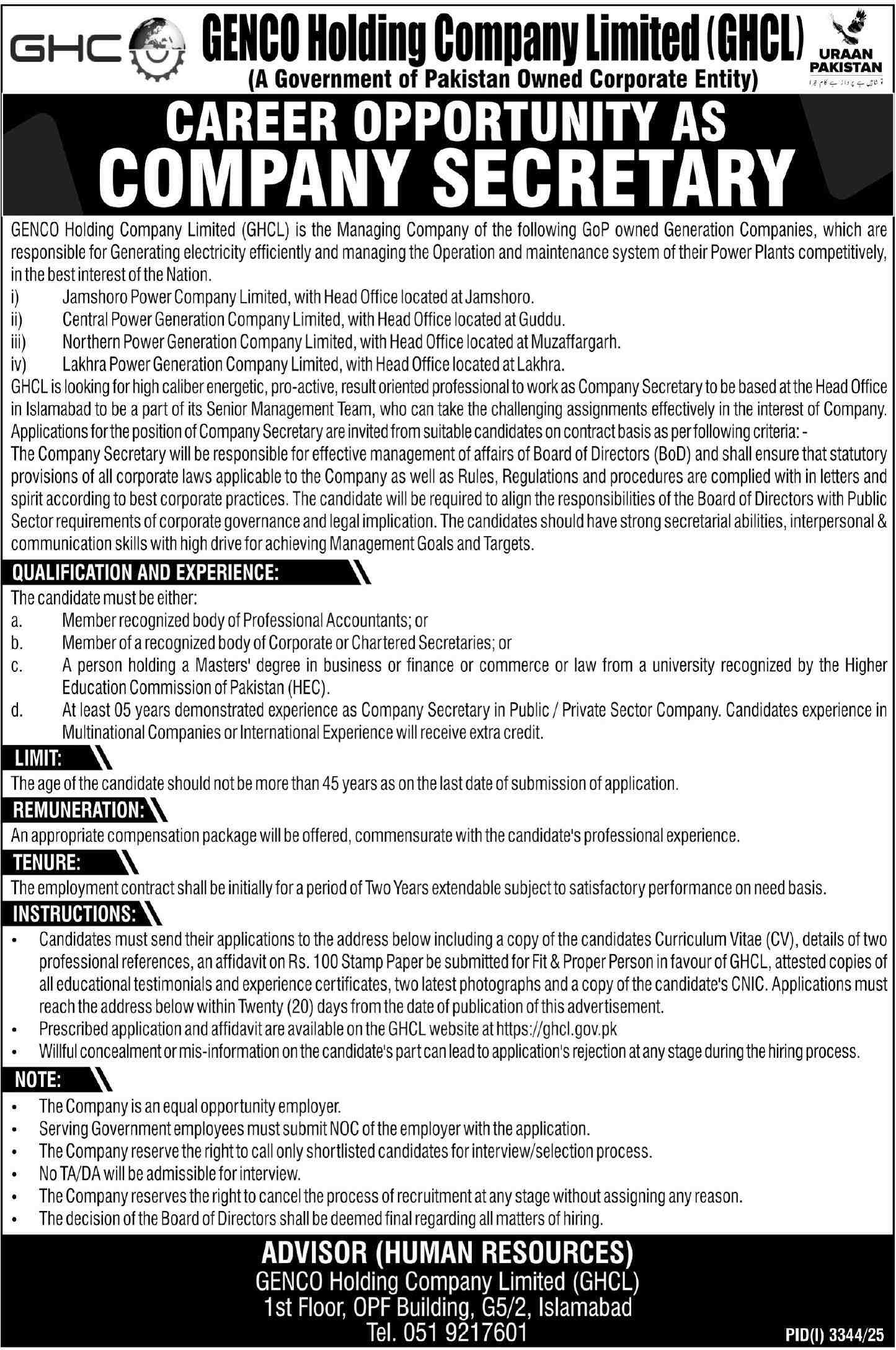 Advertisement of GENCO Holding Company Ltd Jobs 2025 for Company Secretary GHCL Islamabad-295187