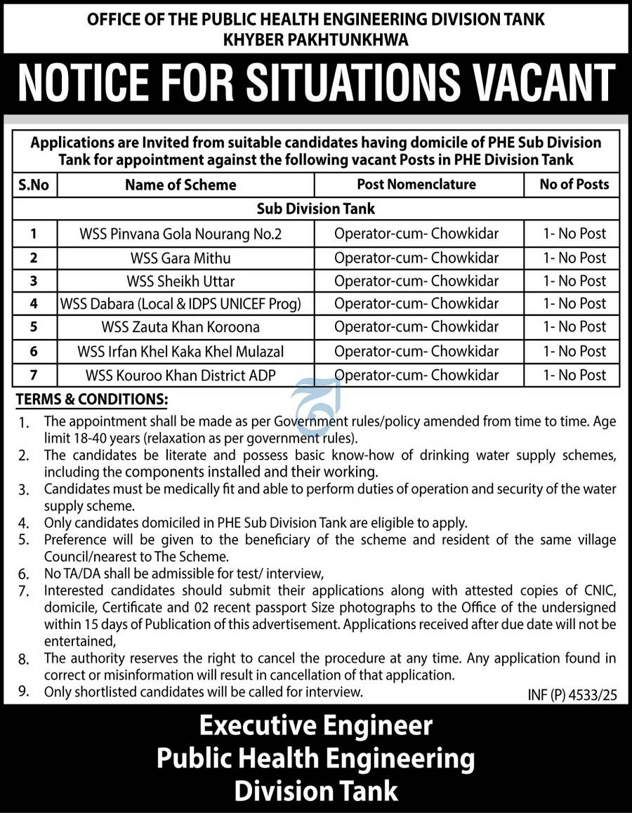 Advertisement of Public Health Engineering Division Tank Khyber Pakhtunkhwa Jobs 2025 for Operators Cum Chowkidar-295193
