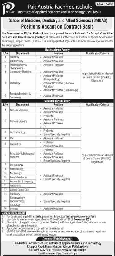 PAF:IAST Jobs 2025 for Teaching Faculty Apply Online | Pak-Austria Fachhochschule Institute of Applied Sciences and Technology Haripur Job Ad shown on this page is taken from The News Newspaper on 25-10-2025
