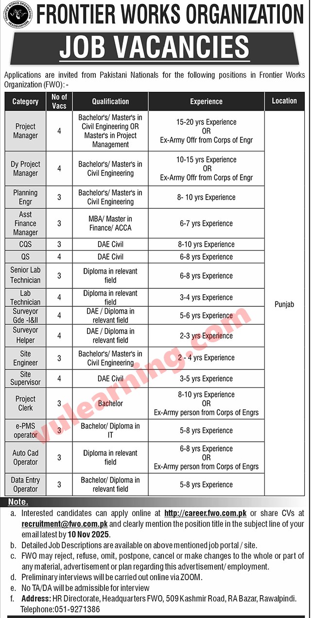 FWO Jobs 2025 Apply Online for Site Supervisors, Data Entry Operators & Others Latest Job Ad shown on this page is taken from Nawa-e-waqt Newspaper on 26-10-2025