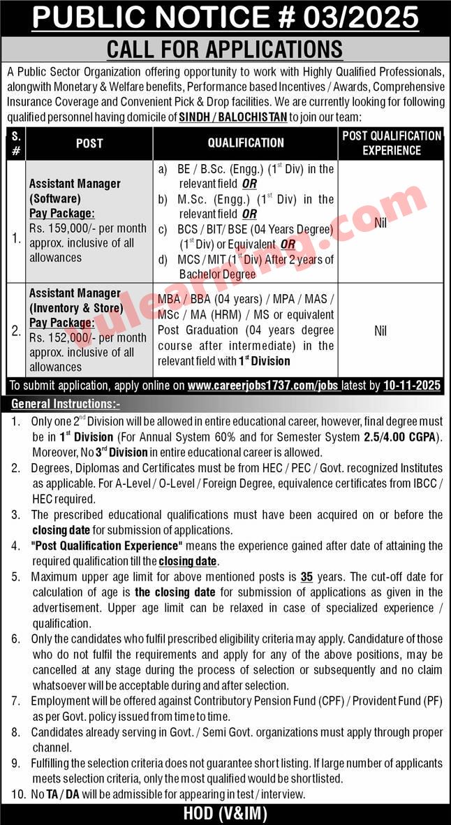 Public Sector Organization Jobs 2025 careerjobs1737 com Apply Online Assistant Managers Latest Job Ad shown on this page is taken from Express Newspaper on 26-10-2025