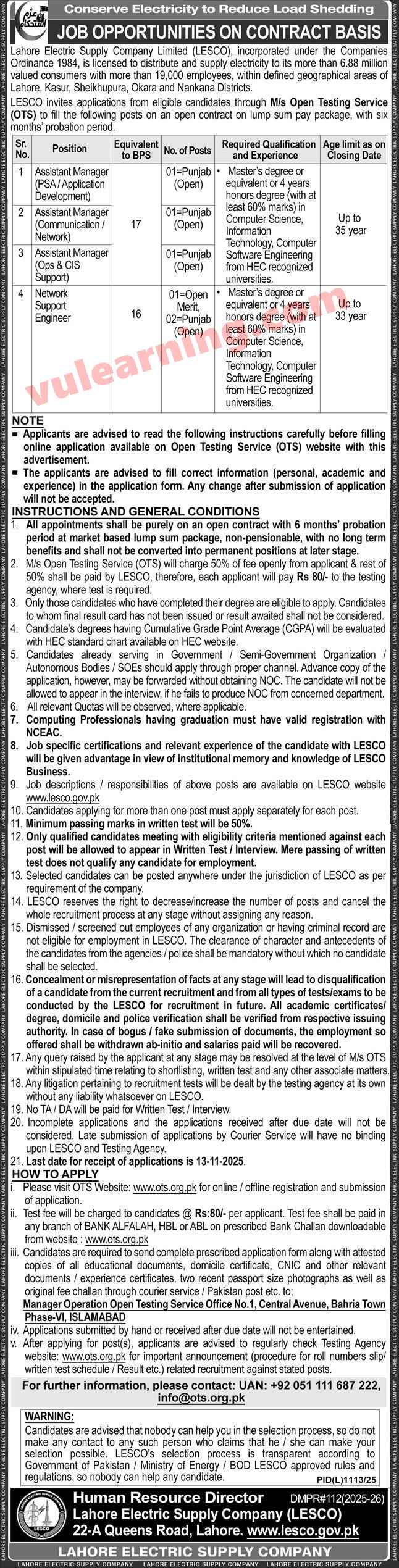 LESCO Jobs 2025 OTS Apply Online Network Support Engineers & Assistant Managers WAPDA Latest Job Ad shown on this page is taken from Nawa-e-waqt Newspaper on 26-10-2025