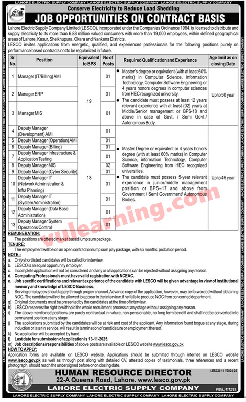 Advertisement of LESCO Jobs 2025 WAPDA Apply Online Deputy Managers & Managers Lahore Electric Supply Company-295205