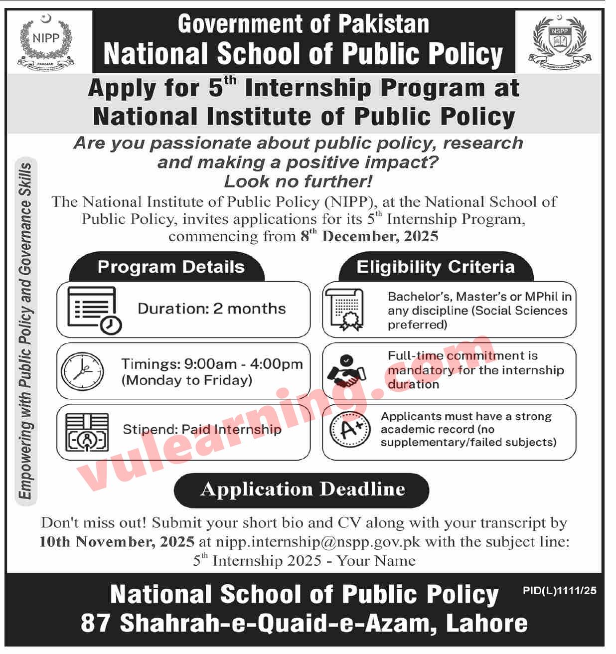Advertisement of National Institute of Public Policy Lahore Internship Program 2025 NSPP / NIPP Latest-295207