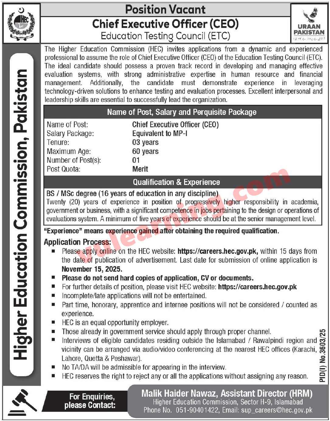 HEC Jobs 2025 Apply Online for Chief Executive Officer (CEO) of Education Testing Council ETC Job Ad shown on this page is taken from Express Newspaper on 01-11-2025