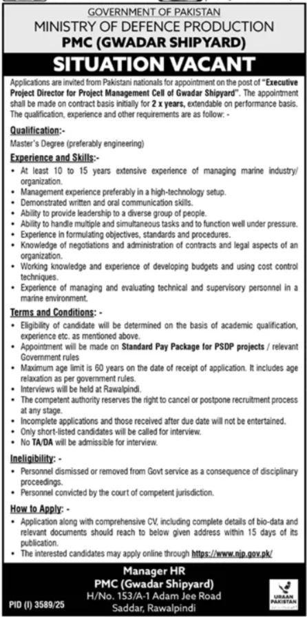 Advertisement of Ministry of Defence Production Jobs 2025 for PMC Gwadar Shipyard Apply Online-295220