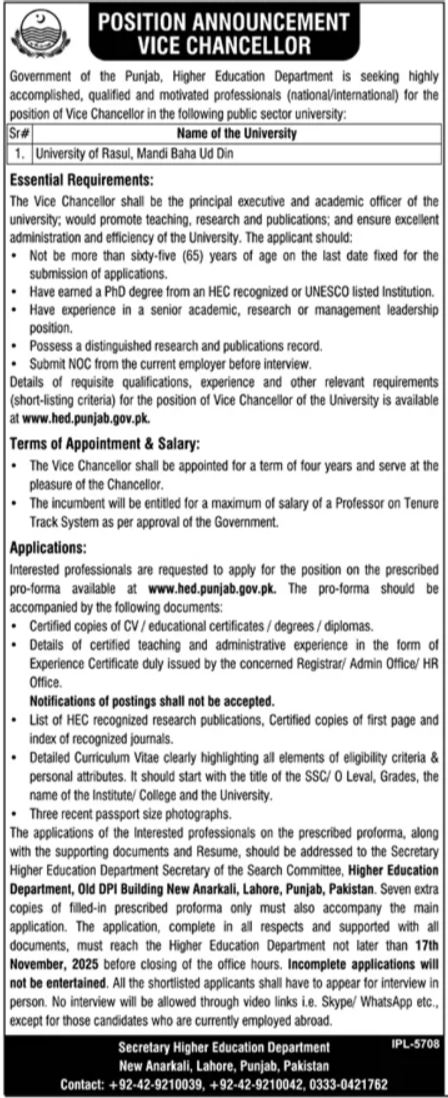 Higher Education Department Punjab Jobs 2025 for Vice Chancellor VC of University of Rasul Mandi Bahauddin Job Ad shown on this page is taken from Jang Newspaper on 01-11-2025