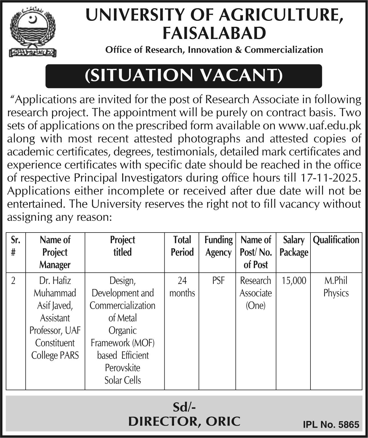 University of Agriculture Faisalabad UAF Jobs 2025 for Research Associate Job Ad shown on this page is taken from Express Newspaper on 04-11-2025