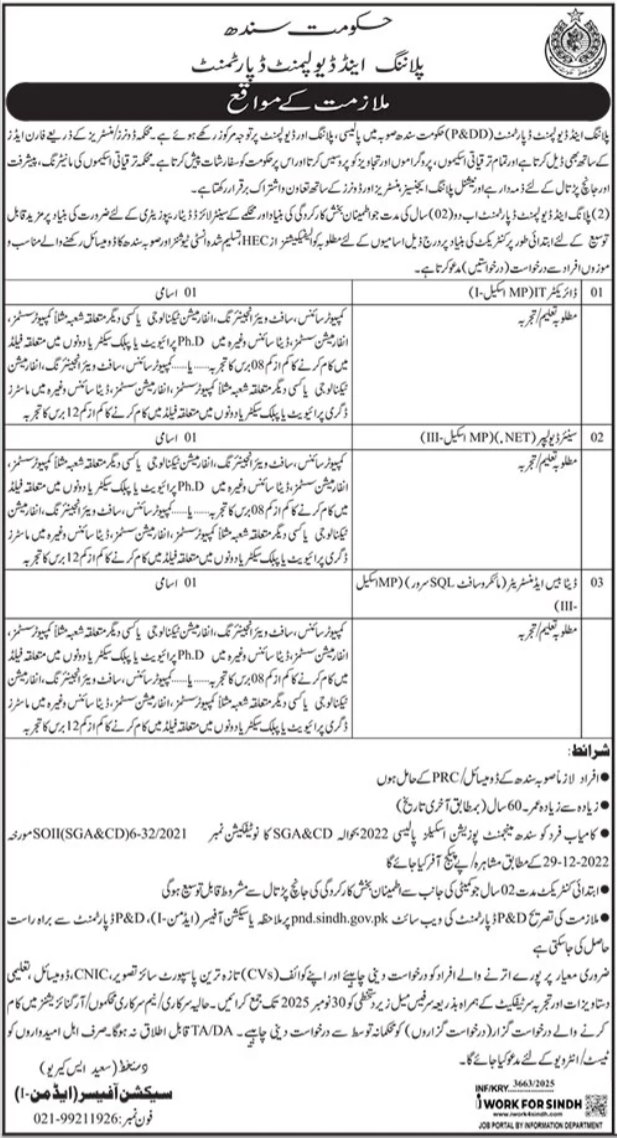 Planning & Development Department Sindh Govt Jobs 2025 P&DD Karachi Job Ad shown on this page is taken from Jang Newspaper on 07-11-2025