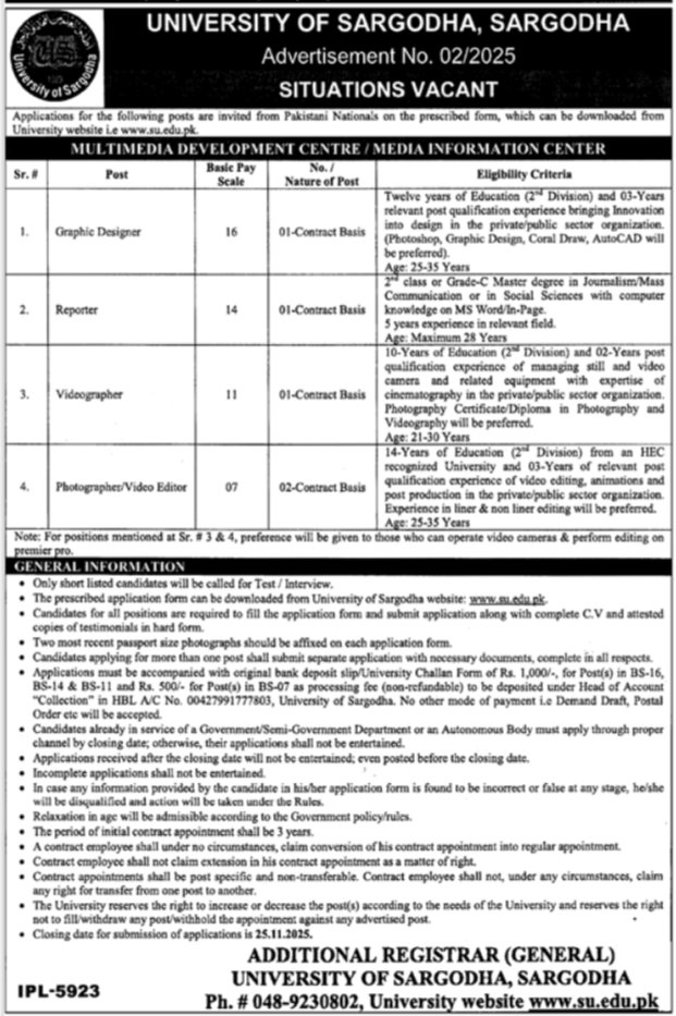 University of Sargodha UOS Sargodha Jobs 2025 for Graphic Designer, Reporter, Videographer & Photographers / Video Editors Job Ad shown on this page is taken from Jang Newspaper on 07-11-2025