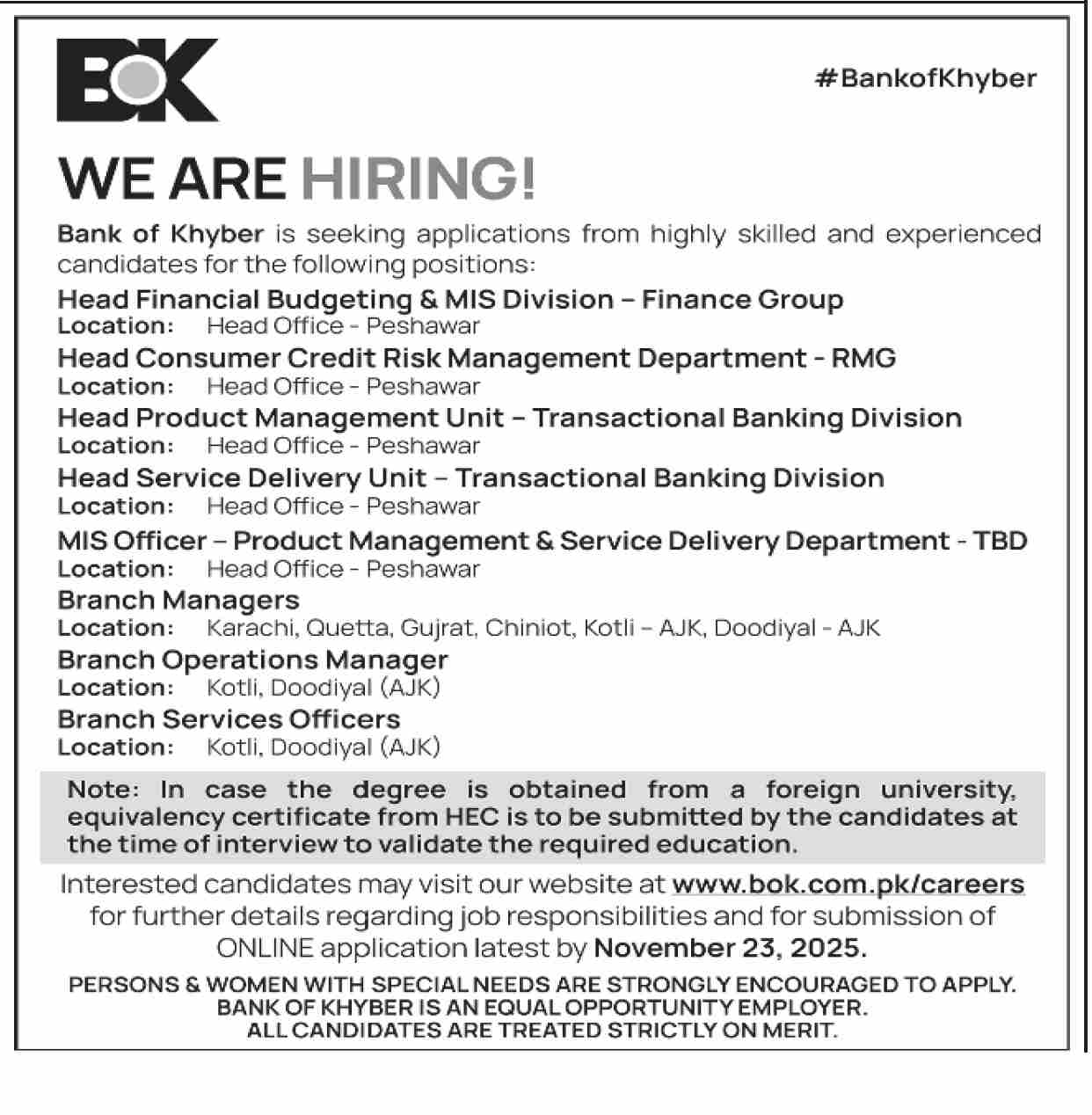 Bank of Khyber Jobs 2025 Apply Online for Branch Managers & Others BOK Latest Job Ad shown on this page is taken from Dawn Newspaper on 07-11-2025