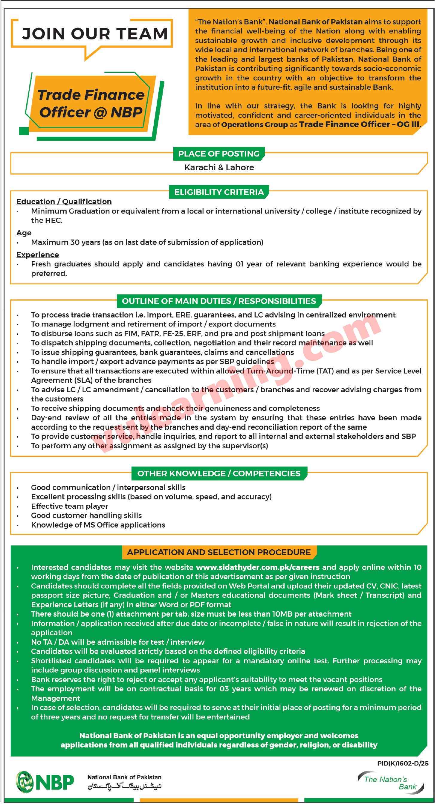 Advertisement of National Bank of Pakistan Jobs 2025 for Trade Finance Officers OG-III NBP Apply Online-295267