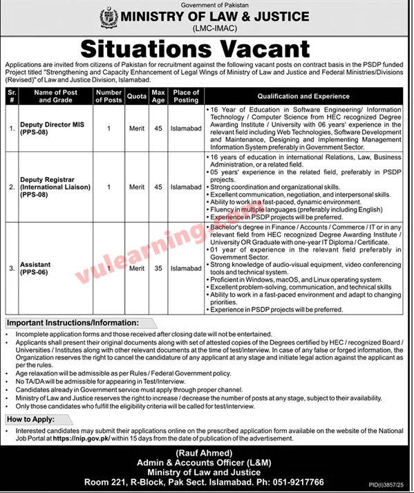 Ministry of Law & Justice Islamabad Jobs 2025 for Assistant & Others Apply Online Job Ad shown on this page is taken from Jang Newspaper on 09-11-2025