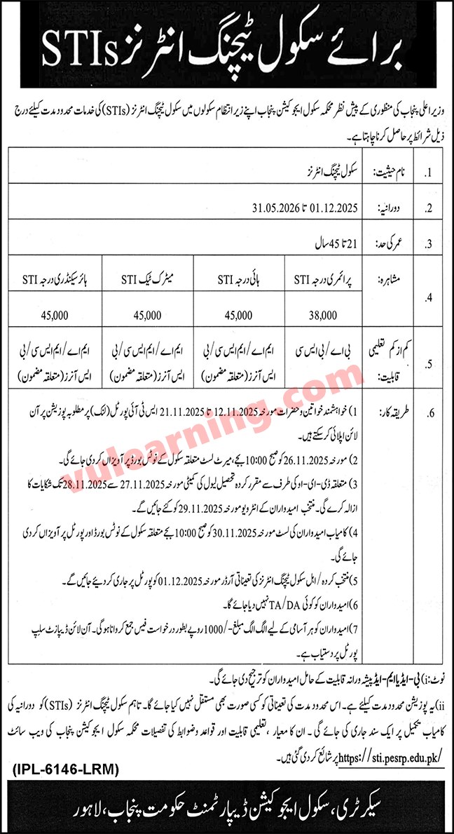 STI Jobs 2025 for Punjab Govt Schools Apply Online 12500 School Teaching Interns Job Ad shown on this page is taken from Nawa-e-waqt Newspaper on 09-11-2025